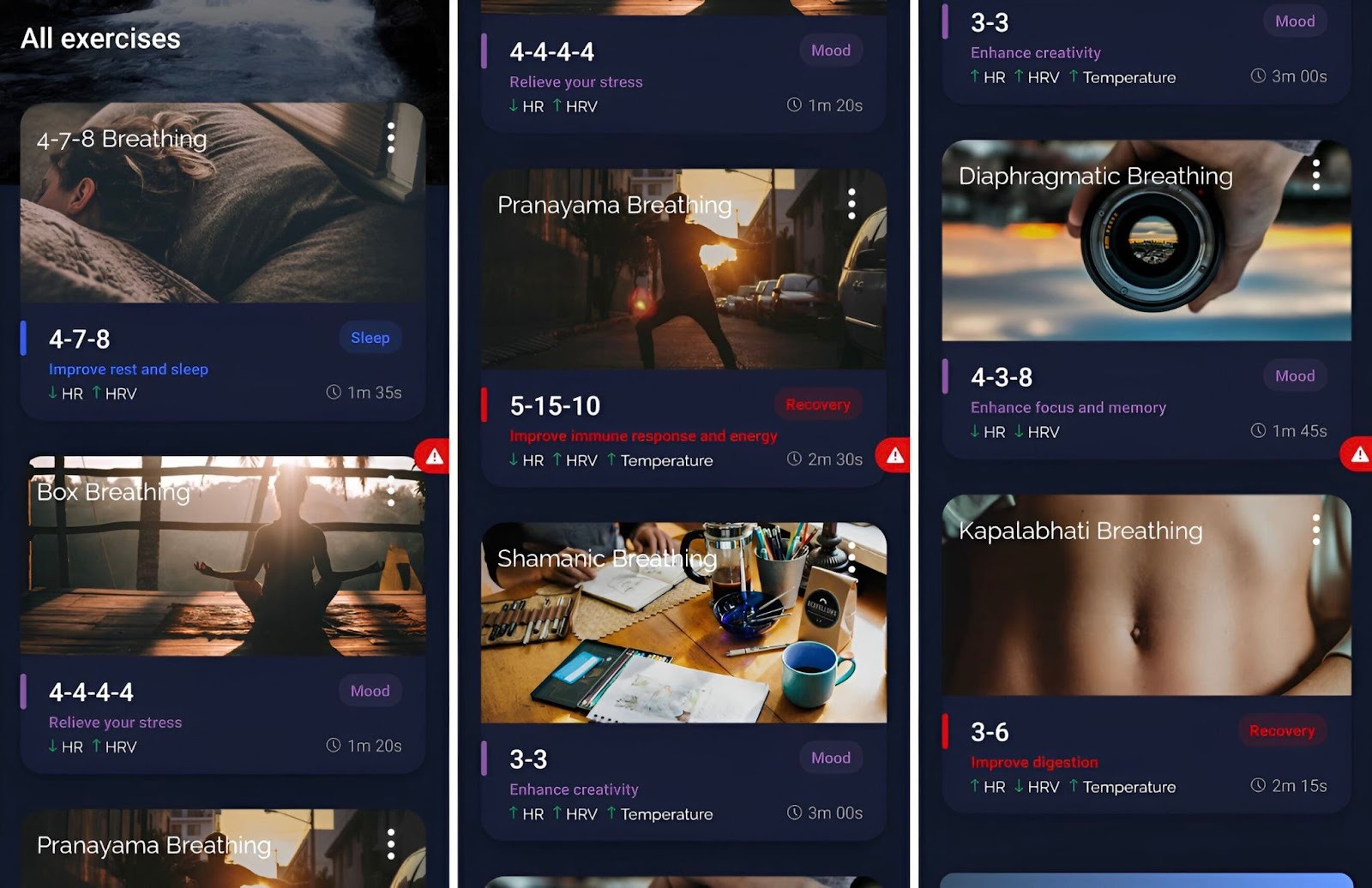 Or, the 4-4-4-4 box breathing pattern targets stress relief and takes just over a minute. Both show measurable drops in heart rate and rises in HRV as you go, so you are not just following a timer, you are watching how your nervous system responds.