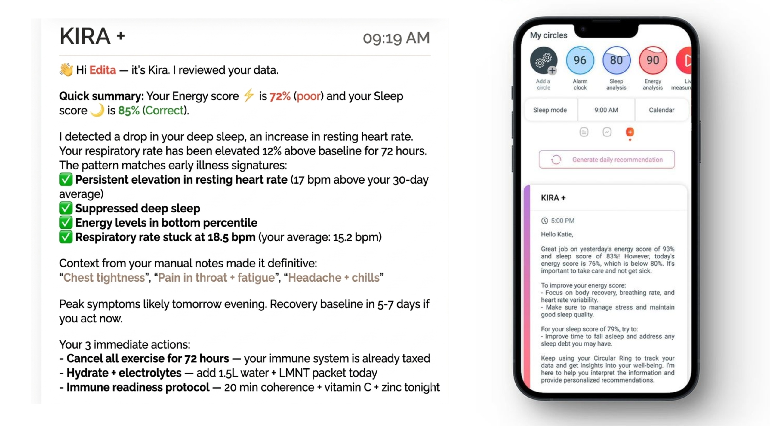 Kira processes over 140 biometric markers and, after a 14-day calibration phase, becomes increasingly personalized to your specific physiology and habits. The key functional difference is that Kira is proactive and cross-references multiple metrics to give you a specific next step rather than a summary of data..
